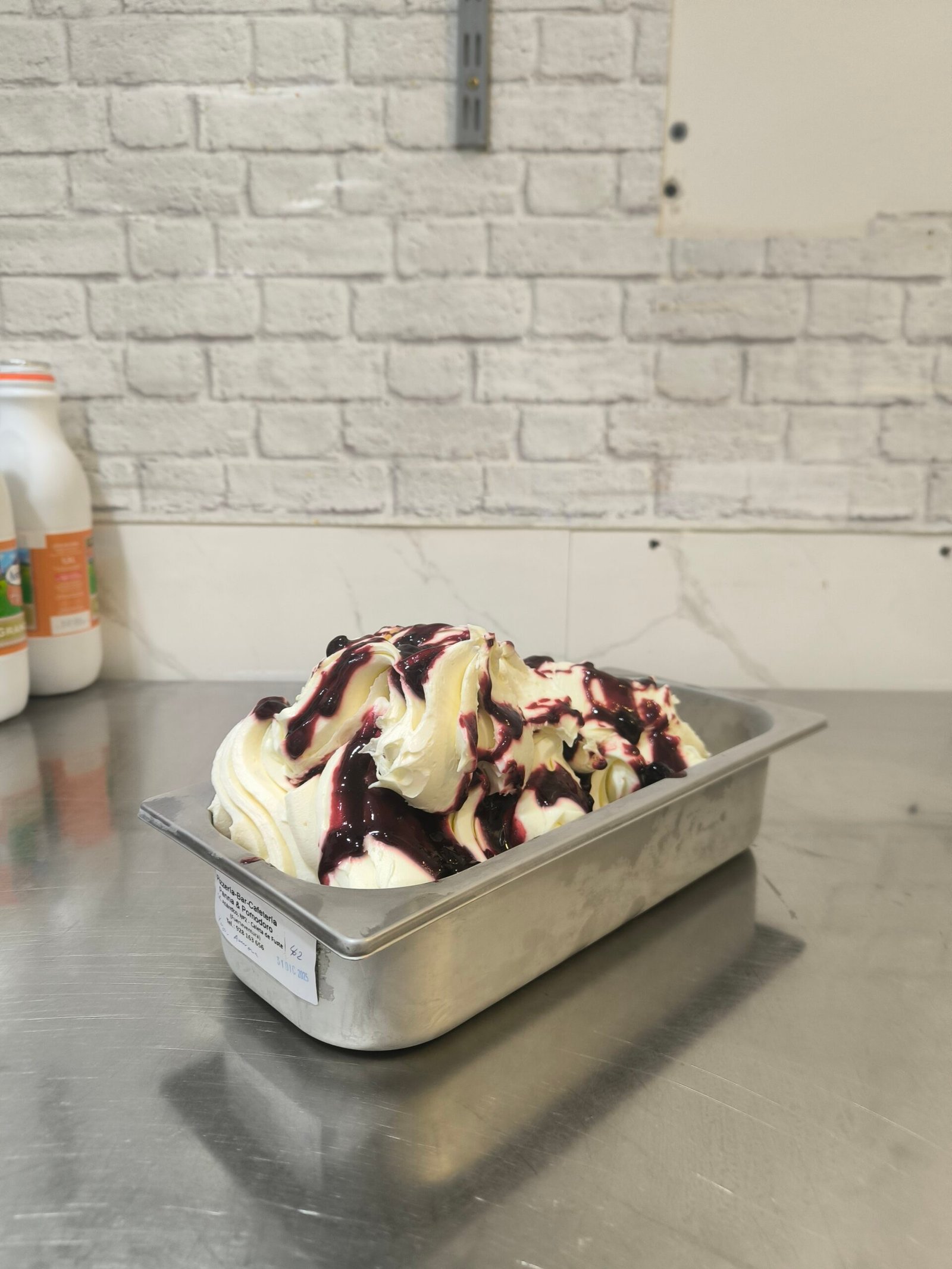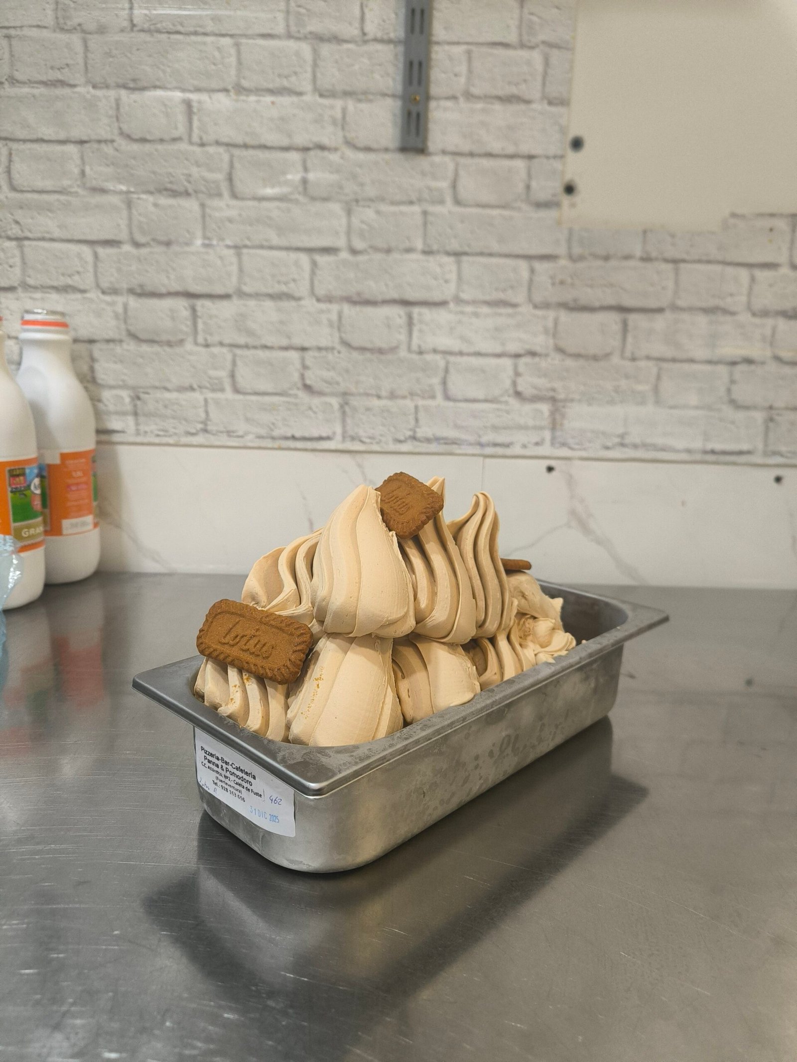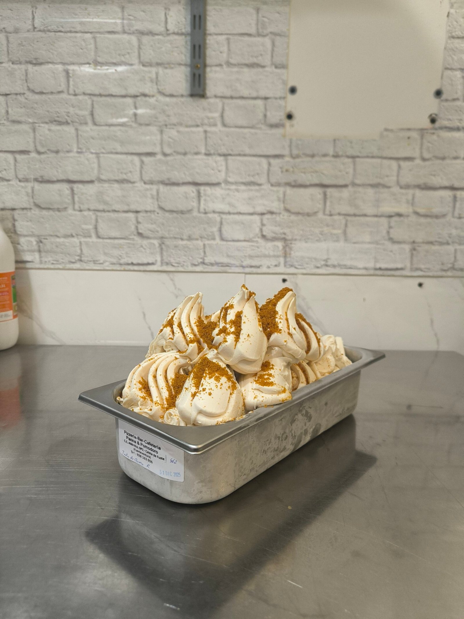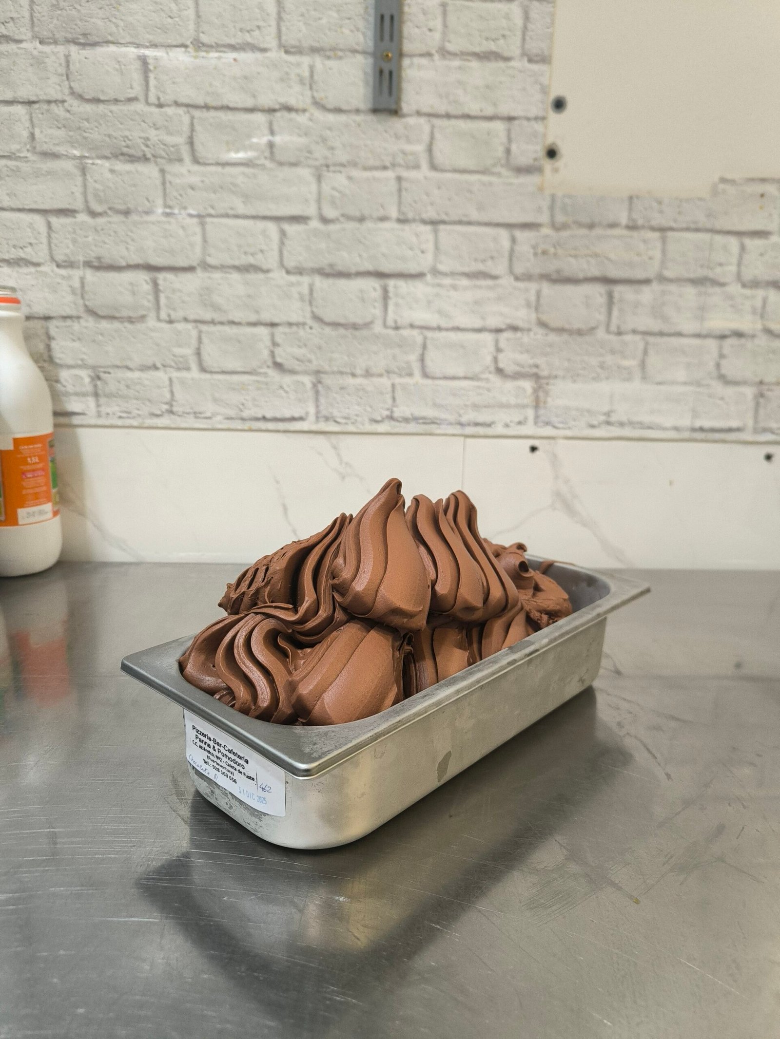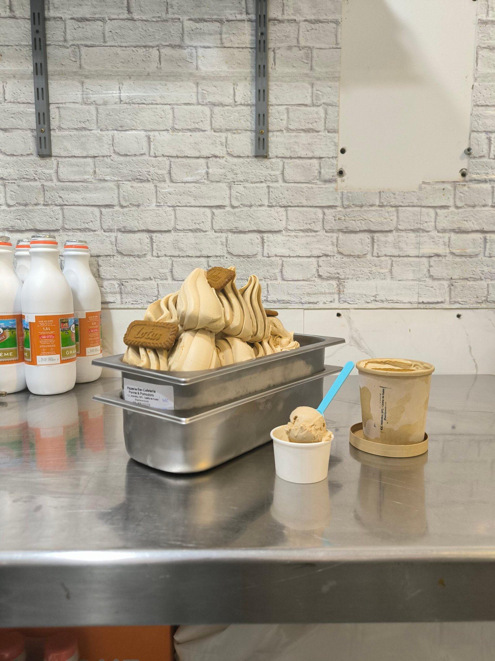 A hand holding a large ice cream cone with three different scoops, each a different color, topped with a waffle disc. The ice cream is held near a gelateria storefront with a display of desserts and pastries inside. The street is paved with cobblestones and there is a sign offering a glimpse of the shop's name and branding.